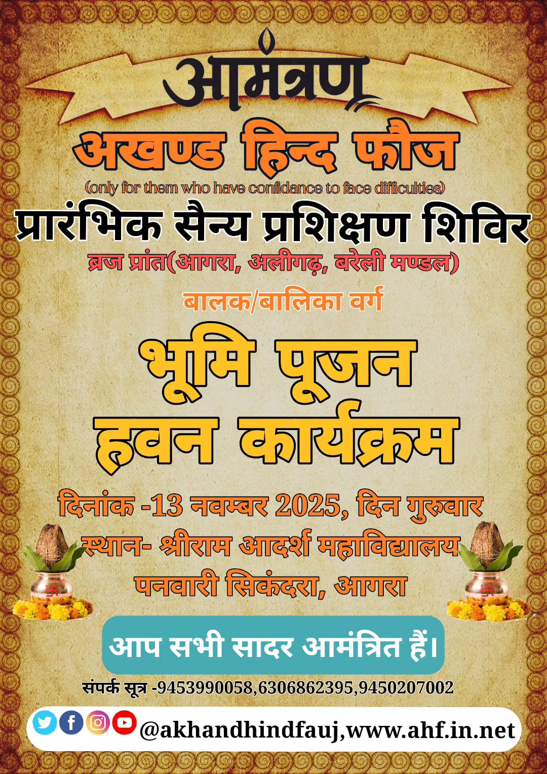 से राष्ट्र को समर्पित हो! अखण्ड हिन्द फ़ौज का प्रमुख उद्देश्य नागरिको में बाल्यावस्था